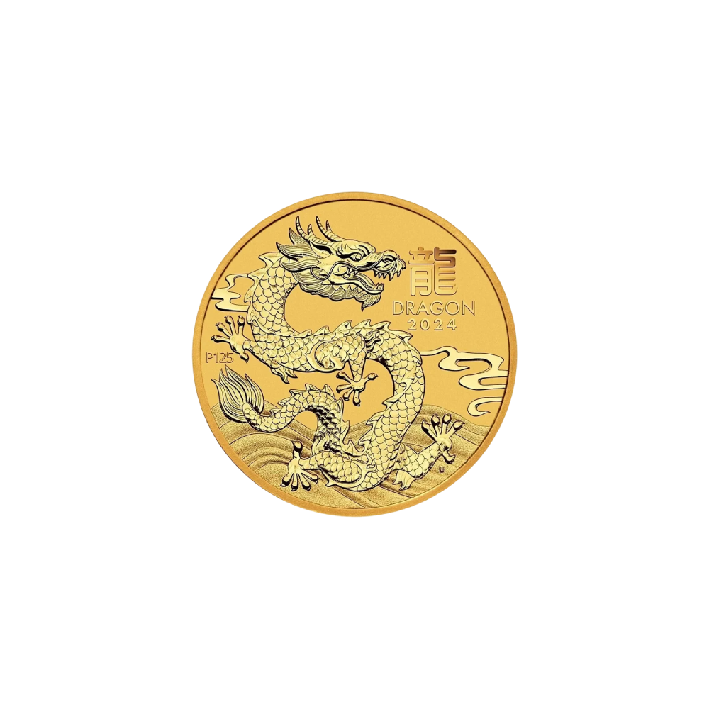 The Year of the Dragon, representing the fifth symbol in the twelve-animal cycle of the ancient Chinese lunar calendar. It features a stylized Chinese mythical dragon on the reverse, symbolizing control over the elements, accompanied by the character for ‘dragon,’ the inscription ‘DRAGON 2024,’ and a ‘P125’ mintmark for The Perth Mint’s 125th anniversary.