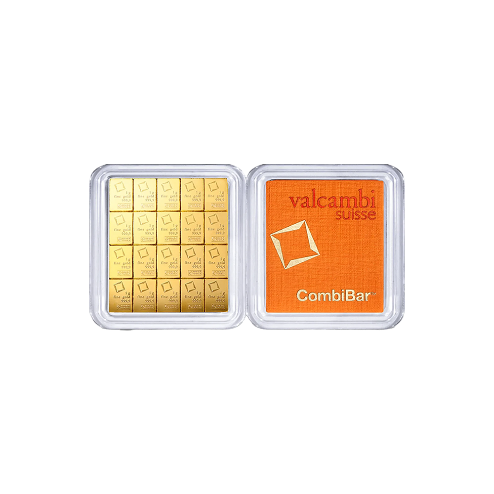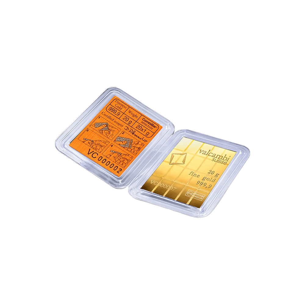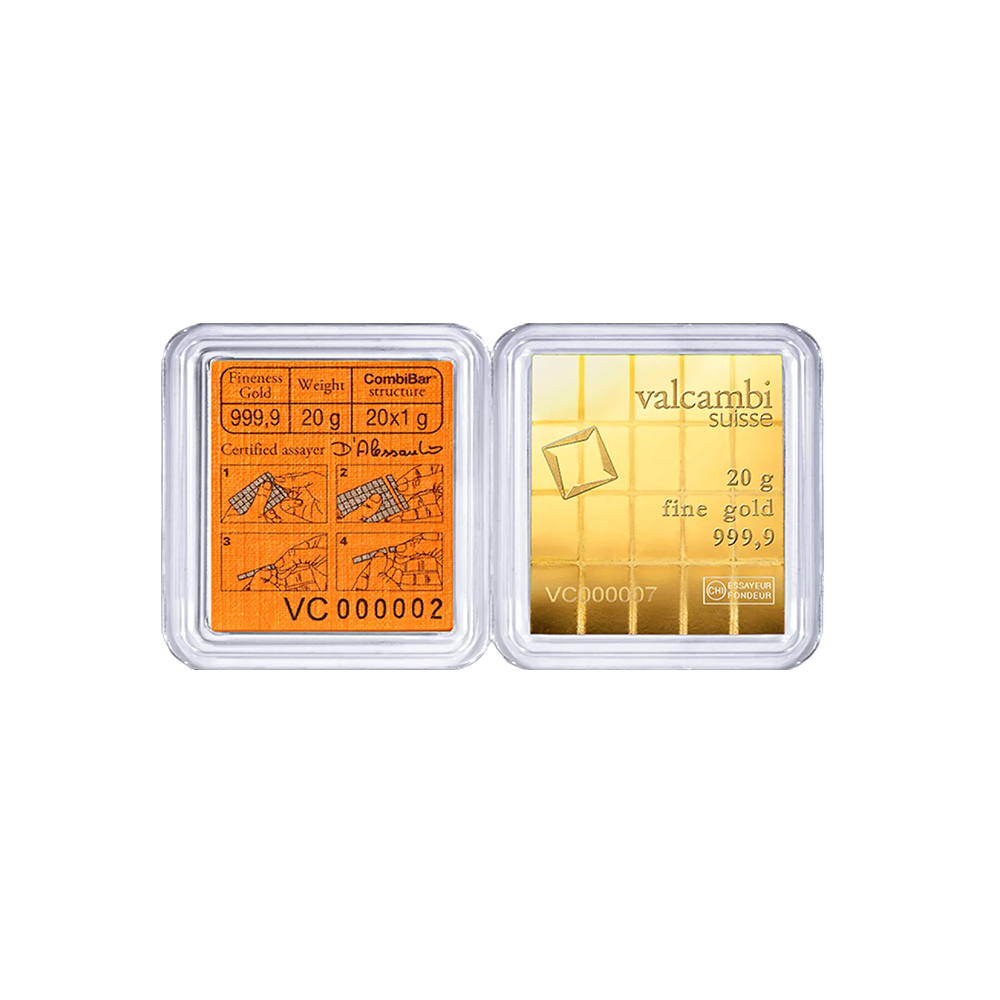 Each 1 gram component bears the Valcambi logo along with its weight and purity. 20 g gold bars come in assay packaging with a tamper-evident seal and a unique serial number giving you full security over your investment.