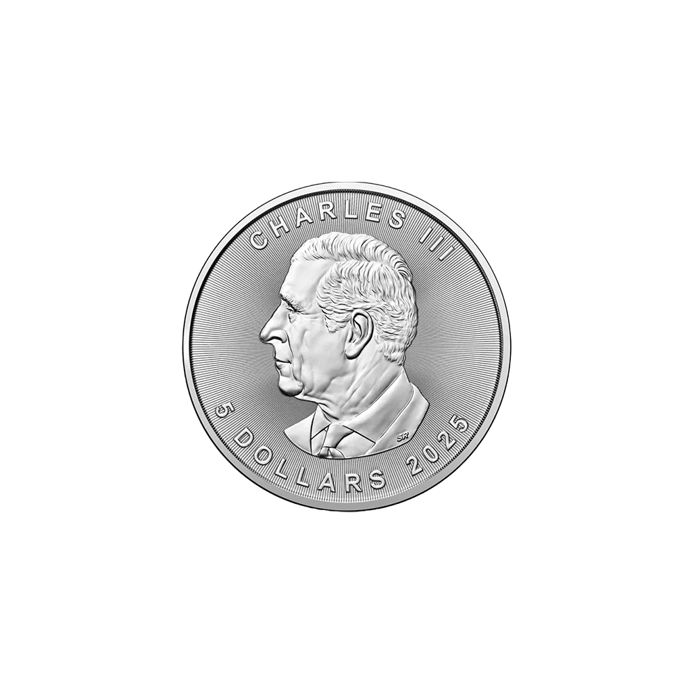 The 2025 Canadian Maple 1oz Silver Coin features the iconic maple leaf design, with the word ‘CANADA’ inscribed above. This 1oz coin includes a small privy mark, micro-engraved with the number ’25,’ which is visible under magnification. This number changes annually to correspond with the year of issue. Details of the coin’s weight and fineness also appear.